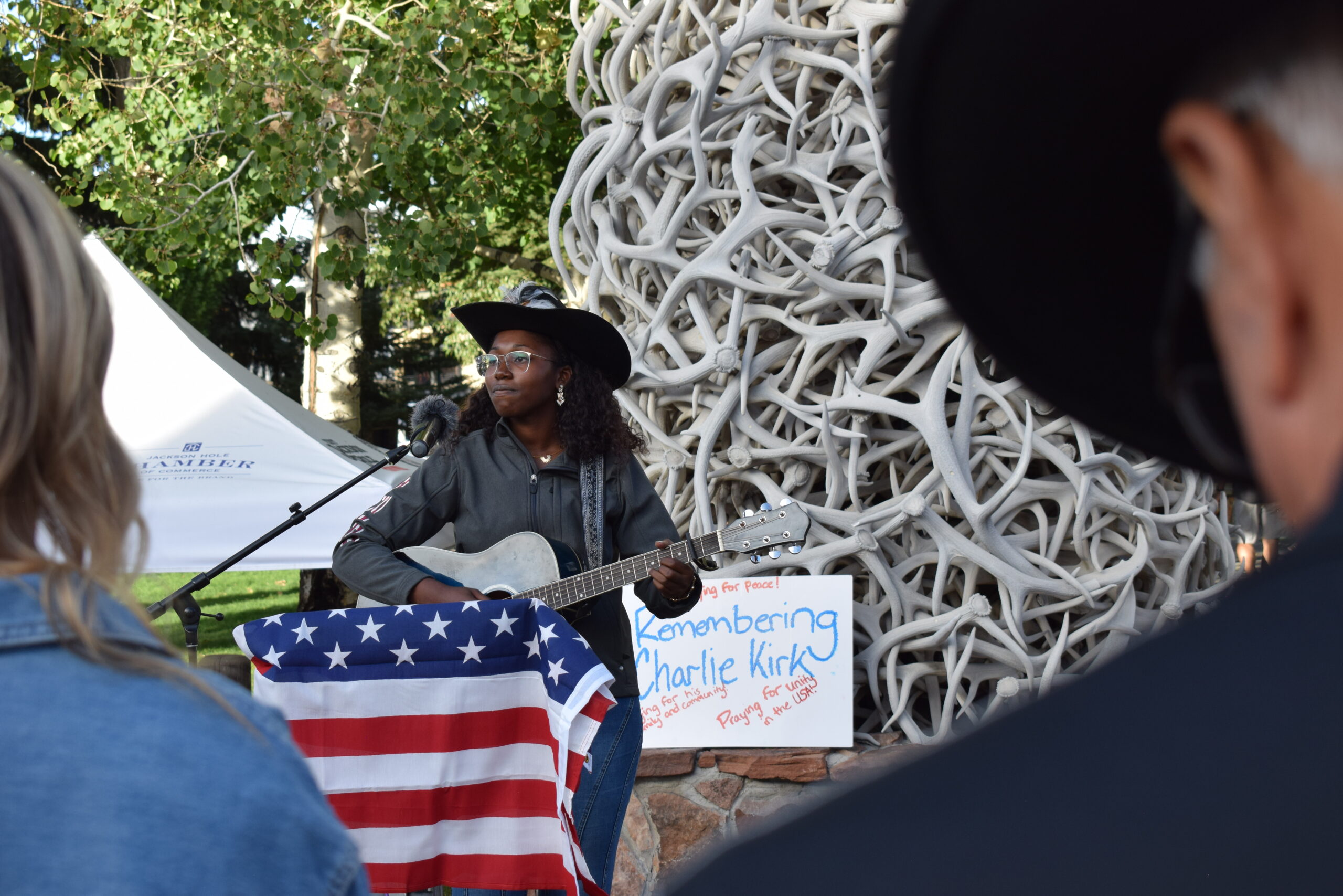 Bea Jones plays for a small crowd on Jackson’s Town Square just hours after the news broke that Charlie Kirk had been assassinated. Jones, a conservative, organized the vigil not as a political space but to “grieve, remember, and stand together in unity.” (Sophia Boyd-Fliegel / KHOL)