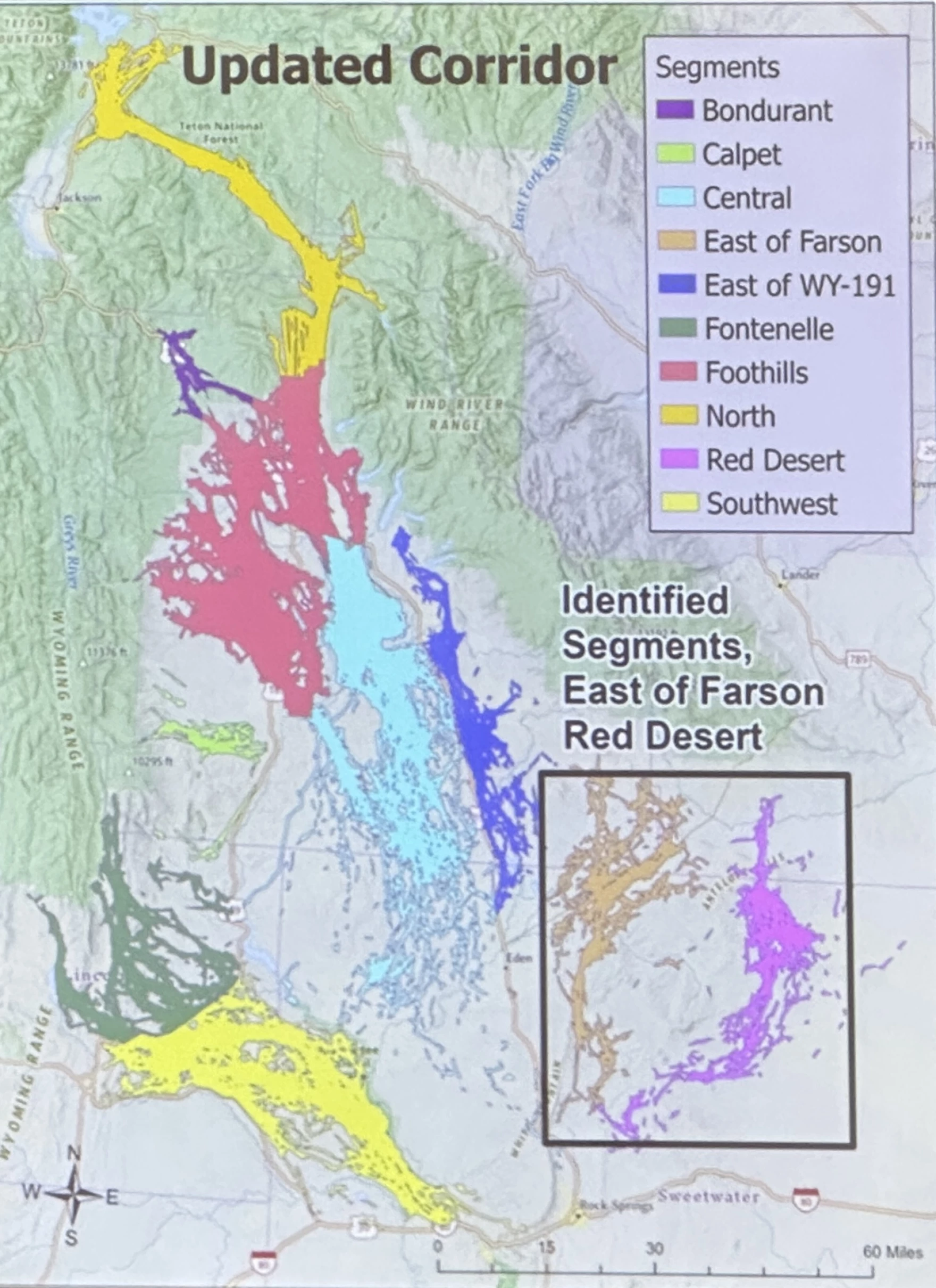 The map of the proposal before commissioners, which shows the East of Farson and Red Desert portions that would’ve been excluded from additional protections. Commissioners ultimately voted to protect the full route. (Caitlin Tan / Wyoming Public Media)