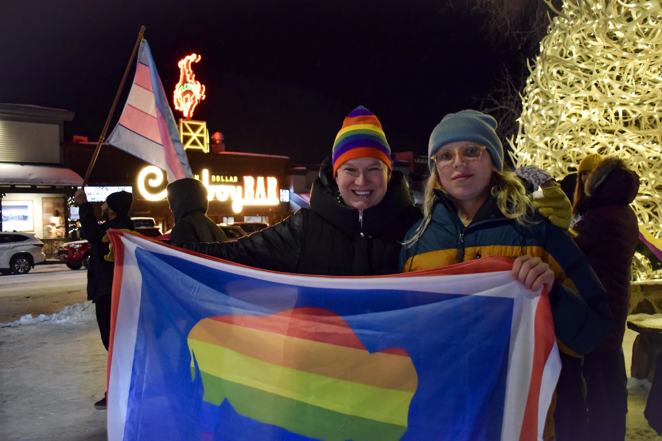 DSC_0049 (1) by Chris Clements | Mar 22, 2024 Kjera Griffith and her child, Augie Henrie, hold up a Wyoming state flag in the pride colors.