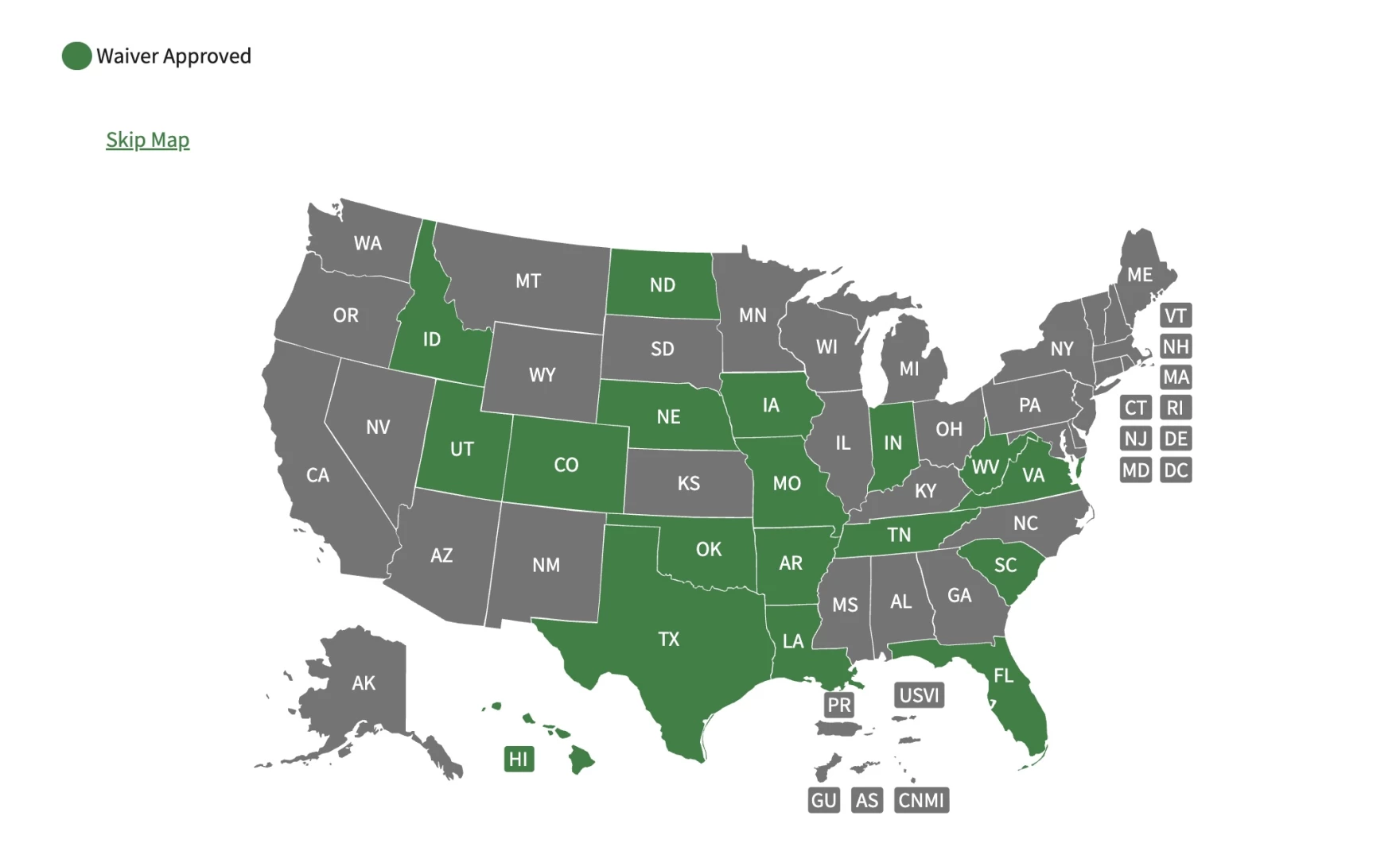 A map from the USDA website shows which states have had SNAP waiver requests approved by the agency. (U.S. Department of Agriculture)